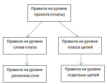 - В том случае, если правило переопределено на более низком уровне иерархии (например, на уровне слоев платы), то новое определение становится актуальным для всех последующих уровней.