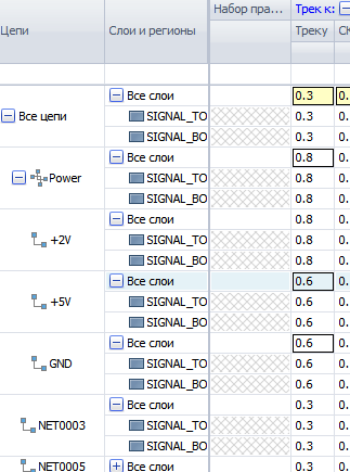 - Для класса цепей Power значение этого правила переопределено как 0,8 мм, а для цепей +5 V и GND как 0,6 мм (на уровне отдельных цепей).