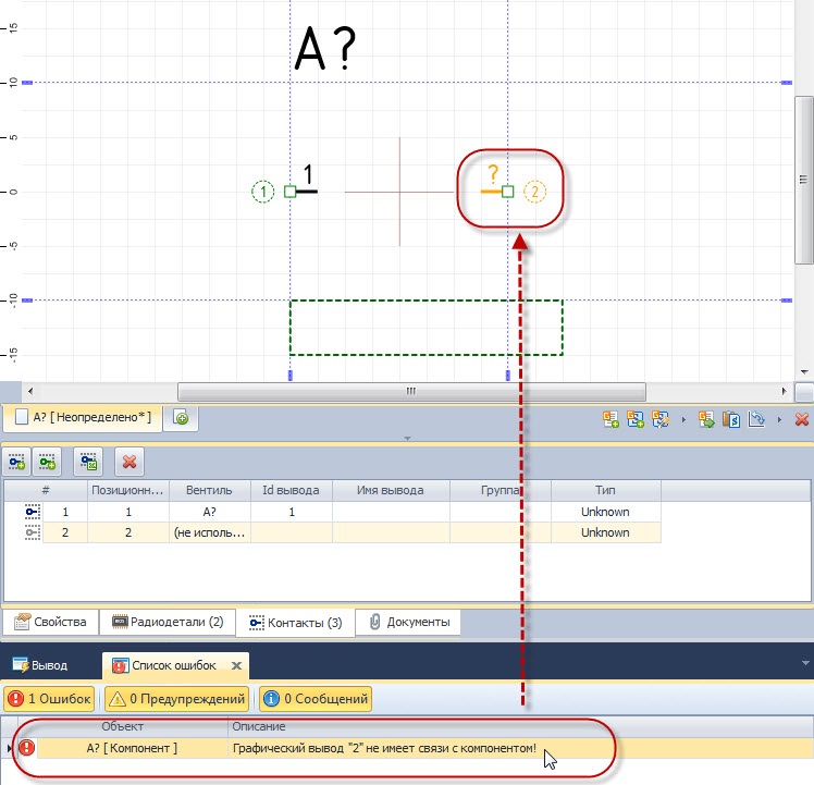 При возврате к редактированию элемента найденные ошибки будут показаны на панели "Список ошибок". При двойном клике левой кнопкой мыши на тексте ошибки в редакторе будет выбран элемент, содержащий ошибку. Этот механизм позволяет быстро локализовать ошибку и исправить ее. В качестве демонстрации на рисунке показан случай, когда один из выводов УГО не сопоставлен с контактом компонента.