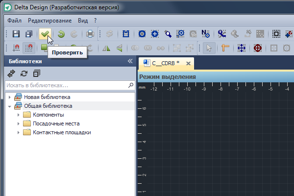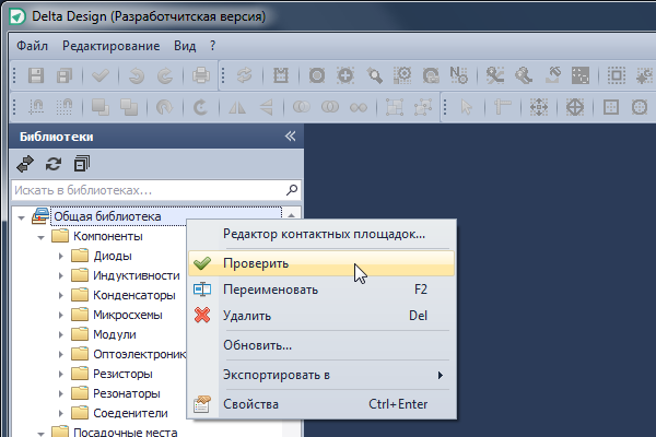 В системе Delta Design осуществляется проверка корректности как описания компонента в целом, так и отдельных составных частей (УГО, посадочных мест). Некорректные данные могут быть сохранены, но их нельзя будет использовать в процессе проектирования. Такой подход минимизирует риск того, что в проектах будут использованы данные, содержащие ошибки. Проверка корректности осуществляется по запросу пользователя и при сохранении данных.
