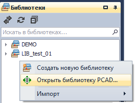 Подключение файла выполняется в контекстном меню в дереве библиотек с помощью команды "Открыть библиотеку PCAD" (рис. 1). В этот момент Delta Design запоминает расположение файла на диске и при последующих запусках будет пытаться его также подключить.