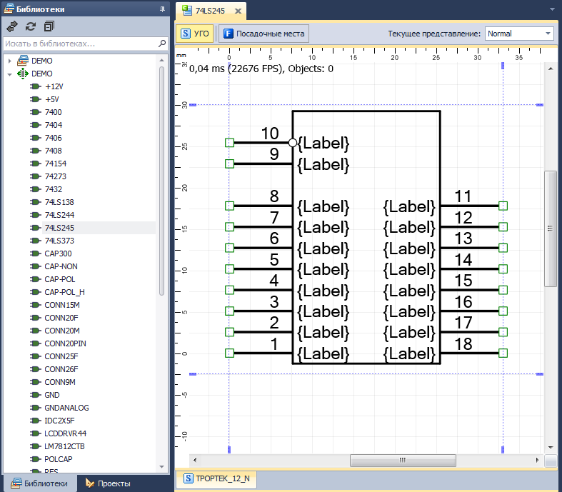 В результате подключенная библиотека появляется в списке и ее компоненты доступны для просмотра. Непосредственно в нашей системе Вы можете увидеть условное графическое обозначение и посадочное место компонента.