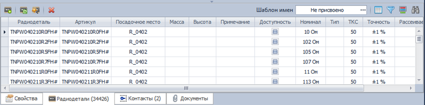 Информация о радиодеталях представлена в виде таблицы, которая отображается на вкладке "Радиодетали" в нижней части редактора компонентов. Каждая строка таблицы соответствует одной радиодетали. В столбцах указываются значения параметров радиодеталей.