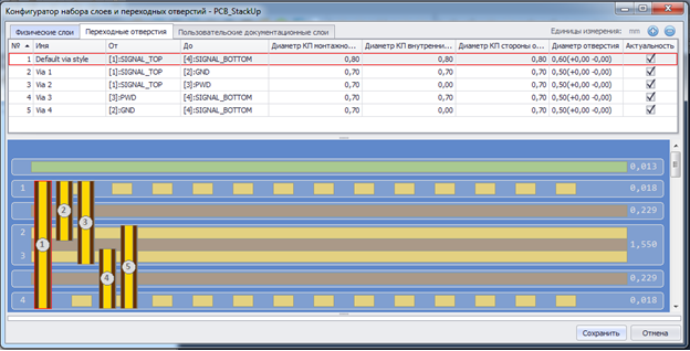 Назначение переходных отверстий является завершающим шагом в формировании структуры слоев печатной платы. Для каждого переходного отверстия задаются слои монтажной и обратной сторон, диаметры сверления и контактных площадок на всех слоях, через которые проходит отверстие.