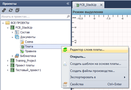 Работа редактора слоев осуществляется для каждого проекта по отдельности. При этом можно использовать подготовленные шаблоны слоев плат.