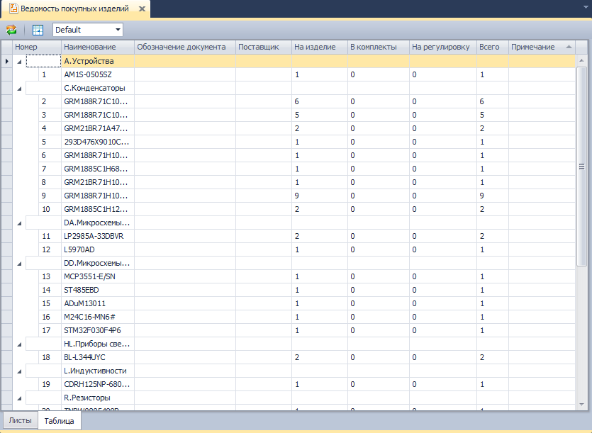 Перед выпуском данные каждого документа могут быть проверены и отредактированы. Например, для каждого компонента может быть указан поставщик, задано количество запасных экземпляров, указано число деталей требуемых на регулировку устройства и т.п.