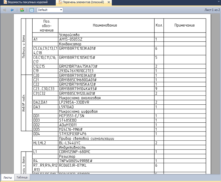 Delta Design позволяет автоматически выпускать отчетную документацию по проекту. Документация генерируется на основании настраиваемых шаблонов. Для выпуска доступны: перечень элементов в плоском и иерархическом видах, а также ведомость покупных изделий. Данные из выпускаемых документов могут быть экспортированы в табличный редактор (Excel).