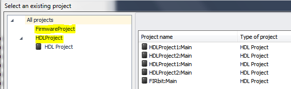 Проект может включать в себя ссылки на другие проекты. При указании ссылки на другой проект компиляция, выполение и отладка происходит совместно. Ссылка из проекта описания аппаратуры можно на другой HDL-проект или на проект прошивки.