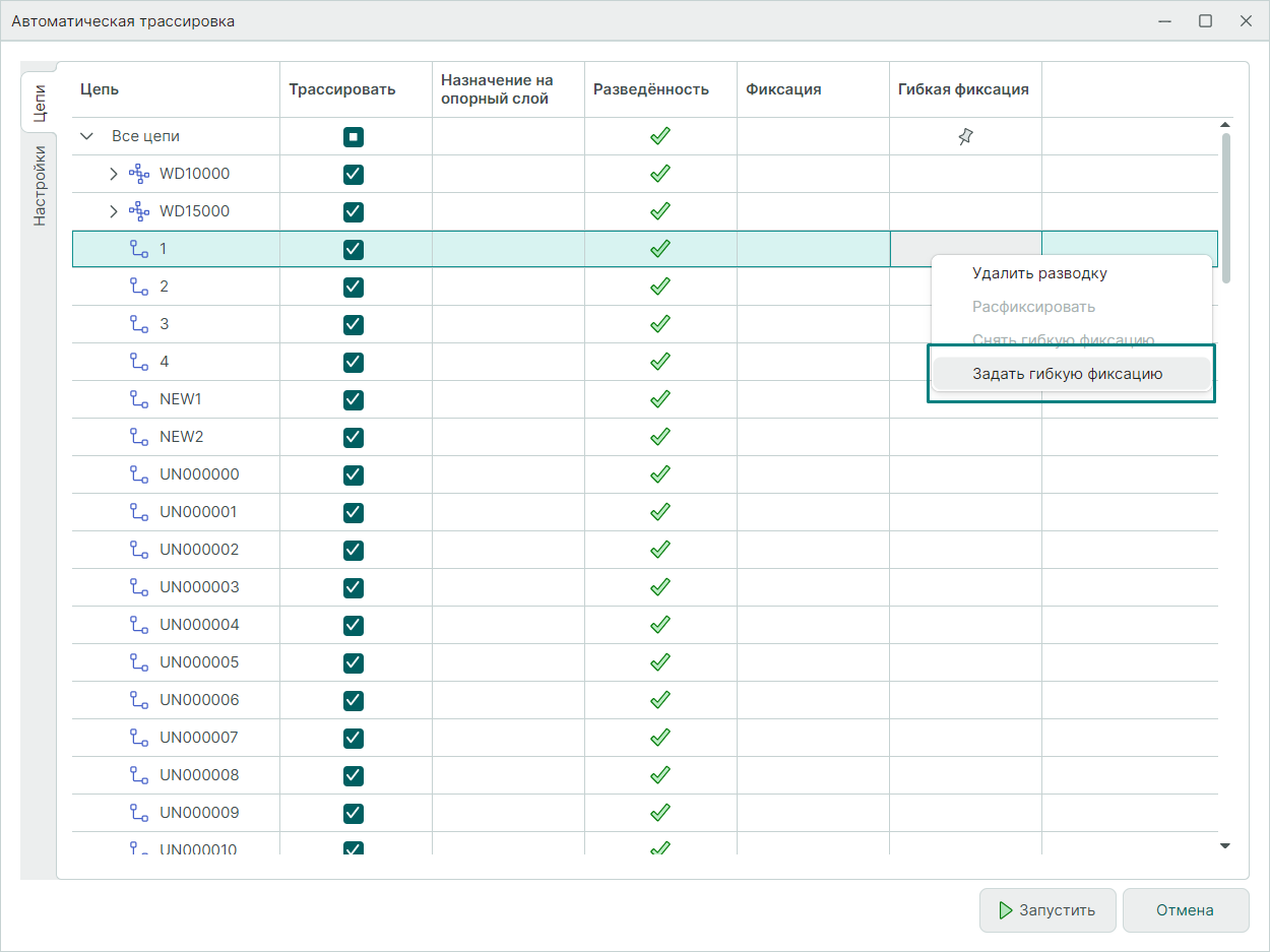 Задать цепь для гибкой фиксацией можно в окне "Автоматическая трассировка" в столбце "Гибкая фиксация" при выборе конкретной цепи (Рис. 1).