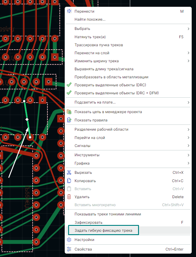 Иногда в процессе доработки изделия возникает необходимость изменить трассировку цепей на разведенной плате, но без изменения трассировки одной или нескольких выбранных цепей. Для этого как раз и существует в режиме "TopoR" инструмент "Гибкая фиксация".