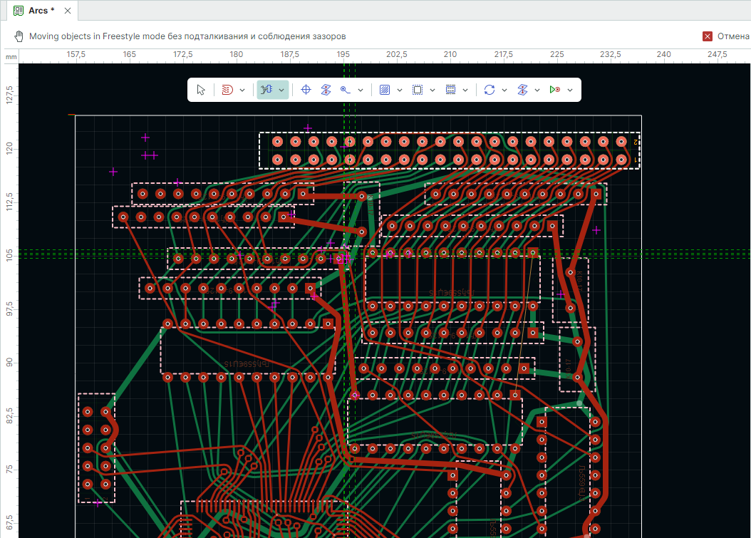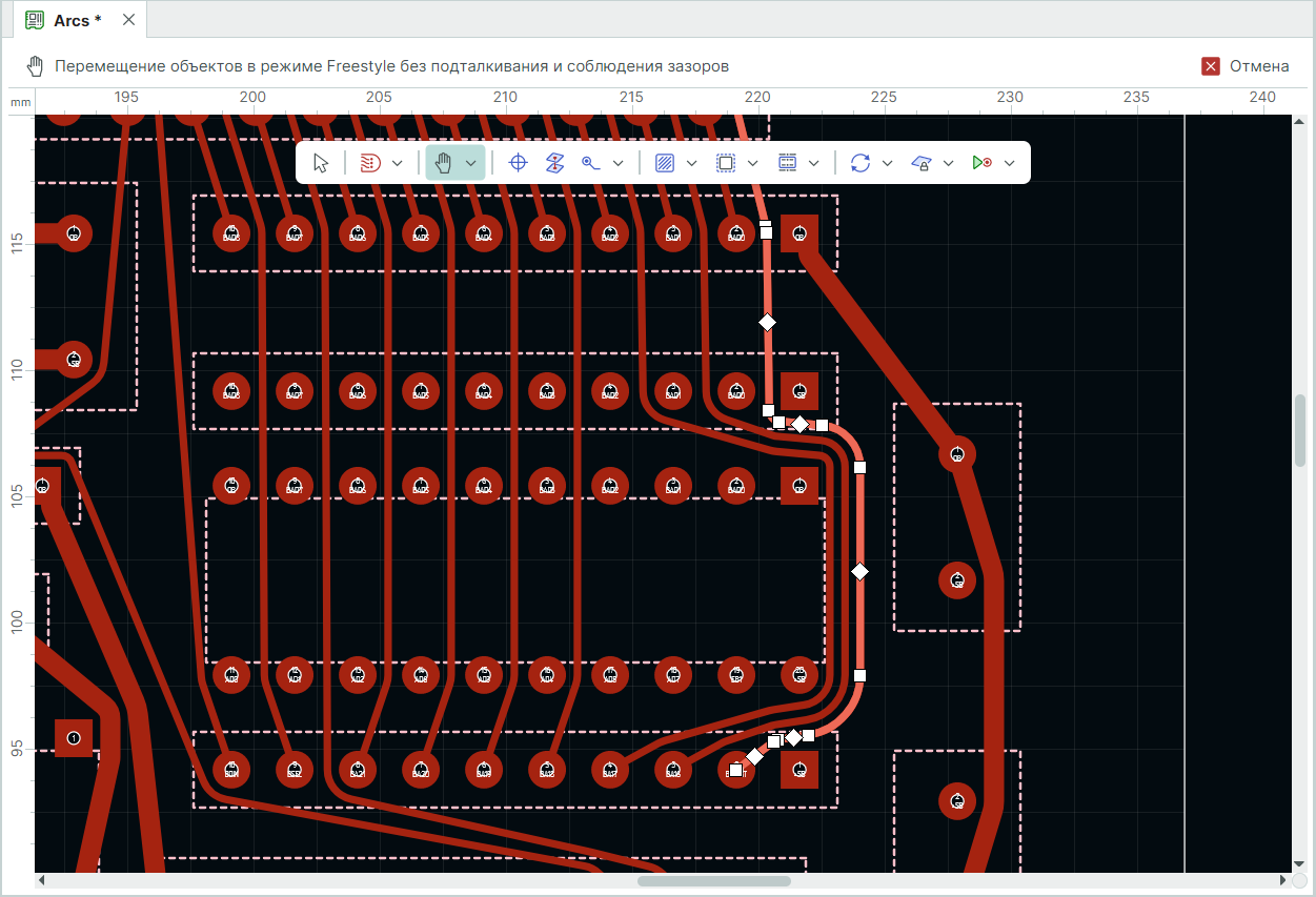 Совет! Режим перемещения "Freestyle" может применяться для улучшения топологии разведённой платы, созданной не только при помощи трассировщика "TopoR", но и любого другого. Оптимальная форма проводников после каждого перемещения вычисляется автоматически.