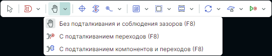 С подталкиванием компонентов и переходов – при перемещении объекта будут подталкиваться компоненты, переходные отверстия и точки ветвления проводников с соблюдением заданных зазоров.