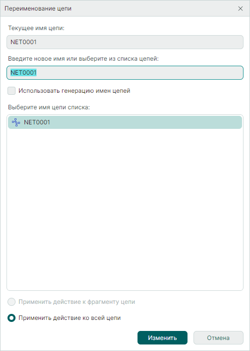 - Если выбрать пункт "Применить действие ко всей цепи", то и данная цепь, и все остальные цепи с таким же именем изменят свое имя на выбранное в данной форме.