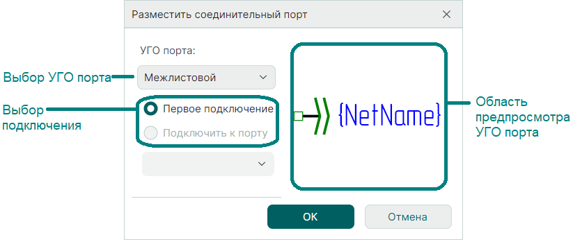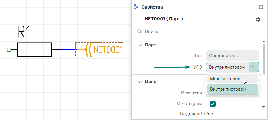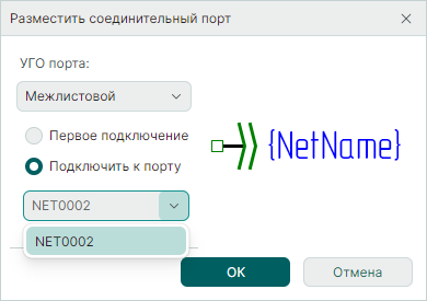 В поле "УГО порта" выберите символ соединительного порта ("Внутрилистовой", "Межлистовой"). Каждому порту соответствует свой символ. В этом же выпадающем списке будут показываться все созданные пользовательские порты с типом "Соединитель".