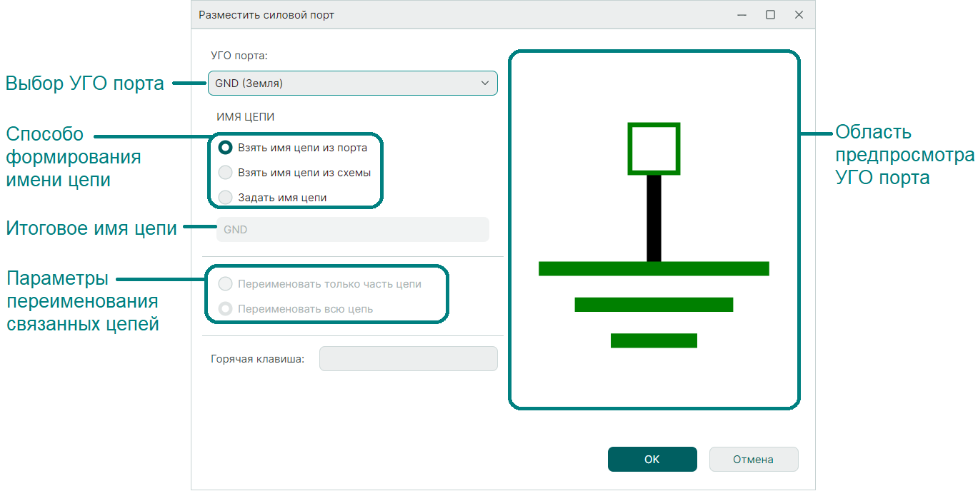 5. Выбрав в форме "Разместить силовой порт" необходимые параметры, нажмите "OK".