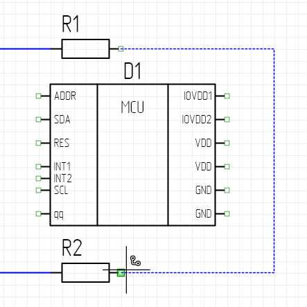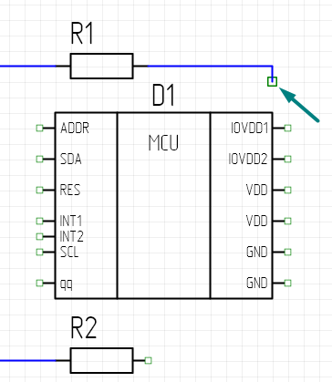 В нашем примере начальной точкой цепи является свободный вывод у резистора R1, и конечной точкой цепи выбран свободный вывод резистора R2. При автоматическом построении цепи было учтено расположение микросхемы D1, то есть цепь автоматически построилась в обход области УГО компонента D1 (Рис. 2).