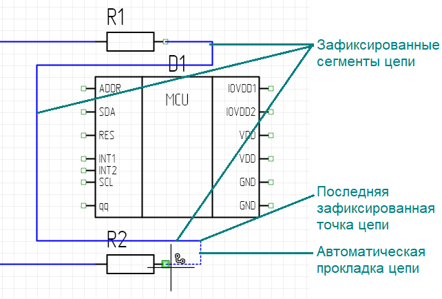 Ручной режим размещения и автоматическая прокладка цепи могут быть использованы комбинированно, так как автоматическая прокладка доступна при наличии зафиксированных вручную сегментов. На схеме сегмент или сегменты, проложенные предварительно, автоматически отображаются пунктирной линией.
