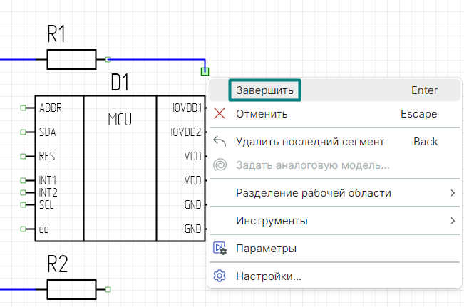Также можно завершить цепь в произвольном месте редактора. Для этого зафиксируйте один или несколько сегментов цепи, нажмите правую кнопку мыши и выберите пункт "Завершить". В этом случае на конце последнего зафиксированного сегмента образуется символ свободного конца проводника (или незавершенной цепи). Этот символ означает, что данная точка доступна для электрического подключения.