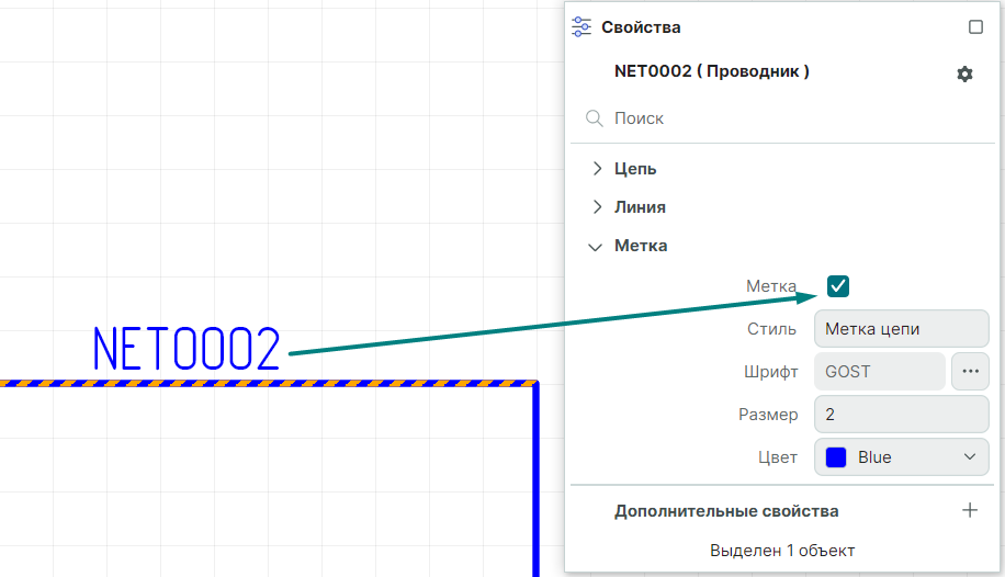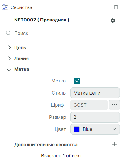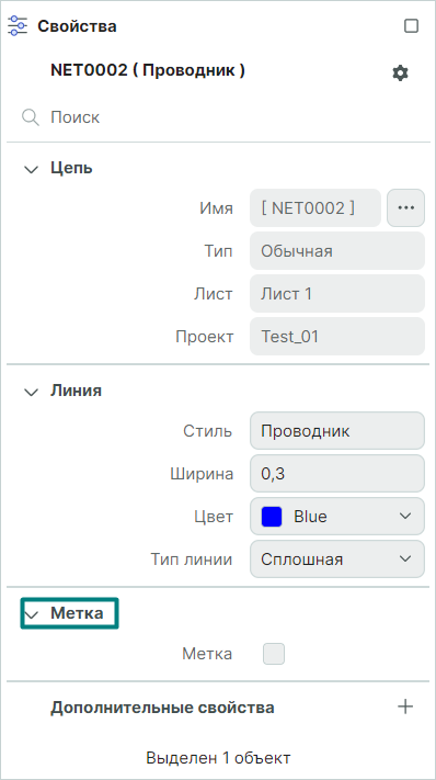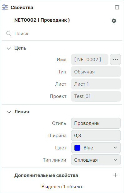 Свойства цепи на схеме отображаются и редактируются с помощью панели «Свойства». В панели отображаются свойства выбранного проводника.
