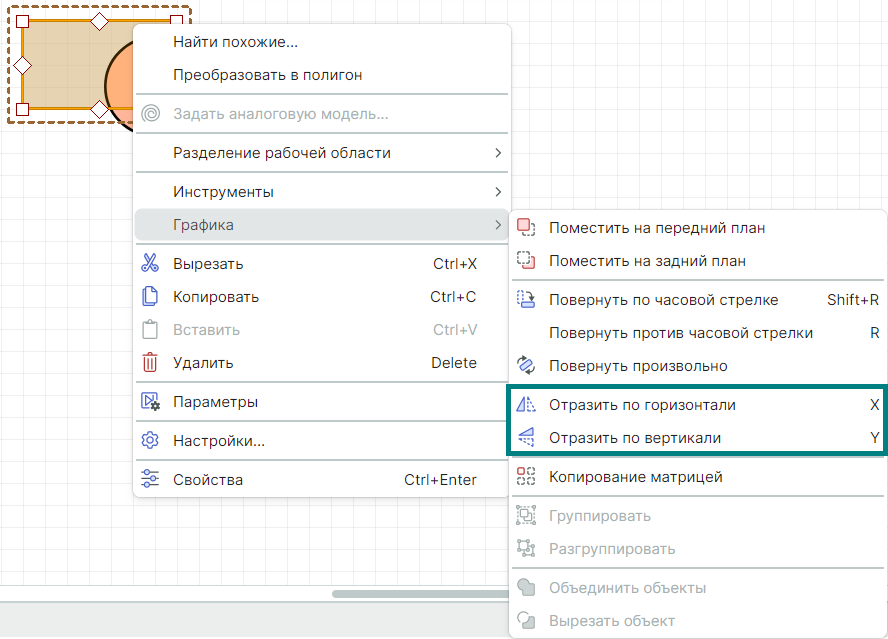 Различные объекты на схеме могут быть отражены относительно осей X и Y. Для горизонтального отображения (относительно оси Y) используйте клавишу "X", для вертикального отображения (относительно оси X) - клавишу "Y". Также доступен вызов соответствующего пункта в контекстном меню (Рис. 18).