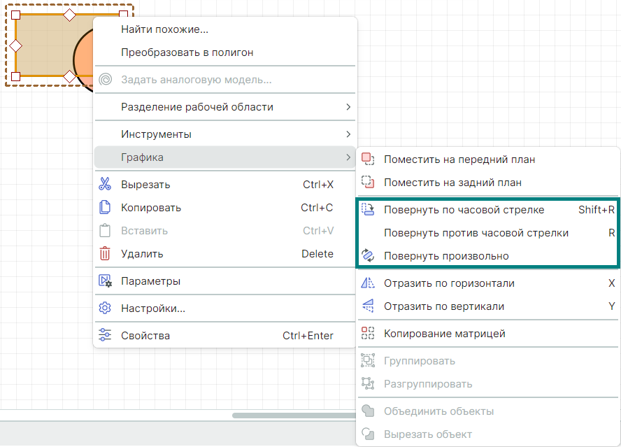 Различные объекты на схеме могут быть повернуты на 90 градусов. Для поворота против часовой стрелке используйте клавишу "R", по часовой стрелки - "Shift+R". Также доступен вызов соответствующего пункта в контекстном меню (Рис. 17).