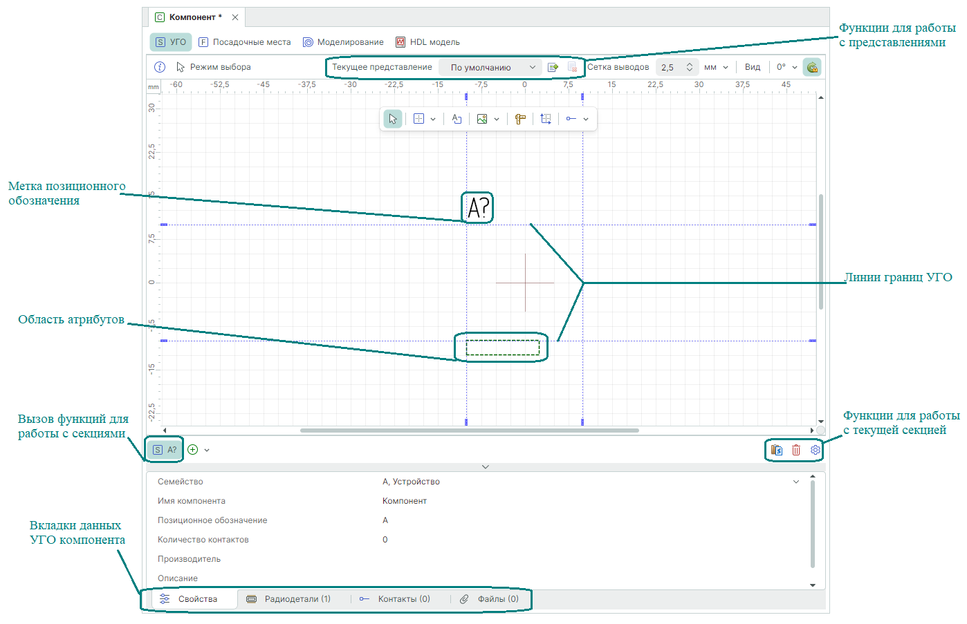 Следует отметить, что в данном окне мы не можем редактировать графику и контакты, а можем только перемещать метку позиционного обозначения, контейнер атрибутов и линии границ компонента.