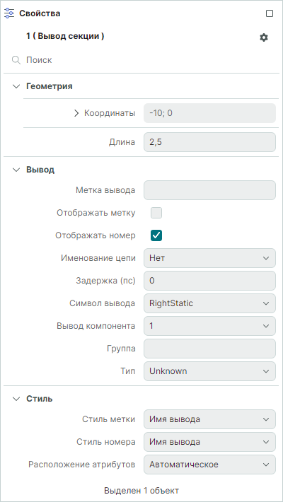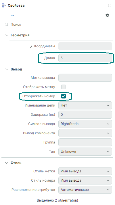 Теперь выделим оба вывода, их свойства будут отображаться в панели "Свойства".