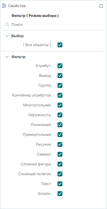 - Если не выделен ни один объект, в панели отображается фильтр выделения (Рис. 8). С его помощью осуществляется выбор типа объектов, которые будут доступны для выделения.
