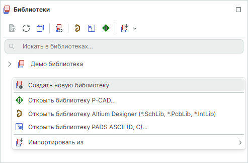На панели "Библиотеки" вызовите контекстное меню на любом свободном месте, выберите пункт "Создать новую библиотеку" (Рис. 2).
