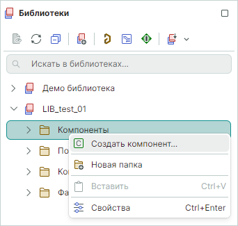 Кликните правой кнопкой мыши на папке "Компоненты", выберите в контекстном меню пункт "Создать компонент" (Рис. 4).