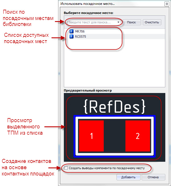 После этого откроется форма выбора посадочного места (Рис. 3). В ней будет представлен список всех посадочных мест текущей библиотеки, которые еще не используются в этом компоненту. В форме выбора посадочных мест доступен поиск по имени. При выборе посадочного места из списка ниже будет показана его графика. В случае, если у компонента на закладке "Контакты" отсутствуют описания контактов, то на форме становится доступна опция создания контактов компонента по назначаемому посадочному месту. Чтобы назначить посадочное место, выберите нужный элемент из списка и нажмите кнопку "Добавить" (либо дважды кликните левой кнопкой мыши по имени посадочного места).