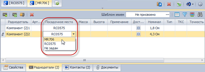 При подсоединении к компоненту первого посадочного места, оно автоматически назначается всем имеющимся радиодеталям на закладке "Радиодетали". Однако, если в компоненте есть какое-либо ПМ, которое не используется в радиодеталях, это вызовет ошибку при проверке и сохранении компонента. Чтобы избежать этого, перейдите на закладку "Радиодетали". Для радиодетали, у которой нужно поменять посадочное место, раскройте выпадающий список в колонке "Посадочное место" и выберите нужное значение (Рис. 5).