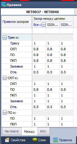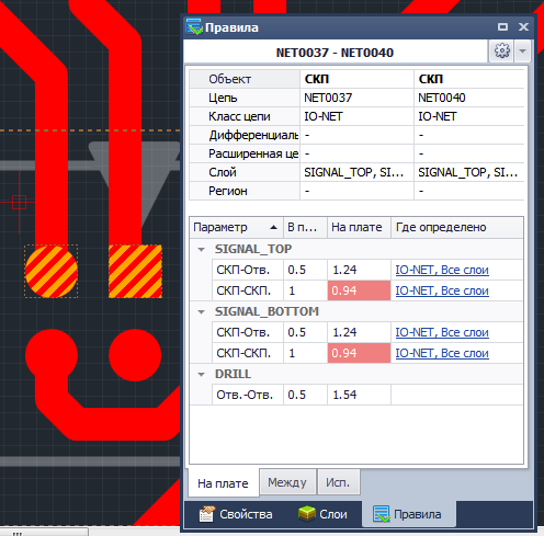 В момент выбора в панели Правила будут отображены, как правила зазоров между цепями выбранных объектов, так и реальные зазоры на плате.