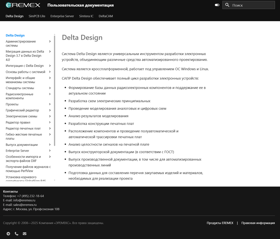 Для удобства пользователей создан сайт документации по продуктам ЭРЕМЕКС docs.eremex.ru. На сайте в структурированном виде представлена документация по Delta Design, SimPCB Lite, Enterprise Server, Simtera IC, DeltaCAM, обеспечивается поиск.